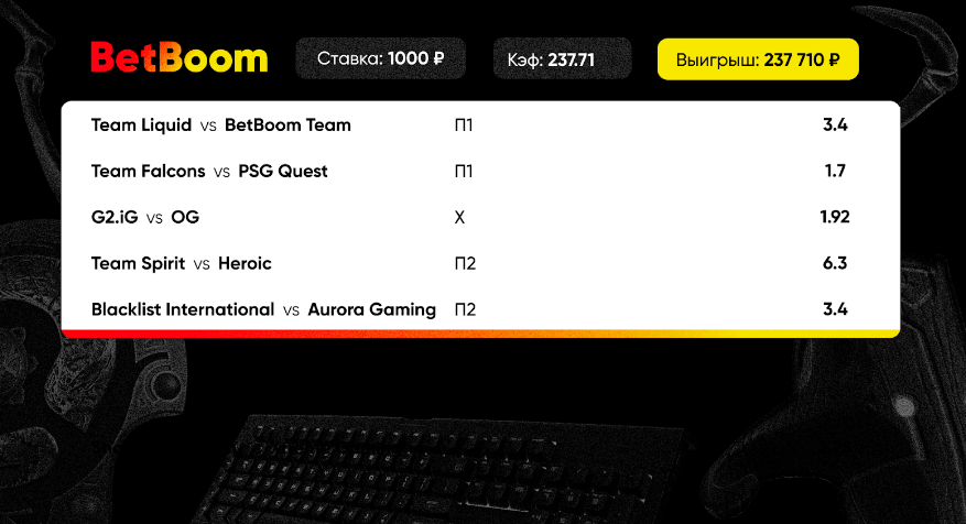 Клиент букмекерской компании BetBoom собрал киберспортивный экспресс с коэффициентом 237.71 — он ставил на исходы стартовых матчей второго этапа Elite League, которые прошли 5 апреля. Поставив 1000 рублей, беттор выиграл 237 710 рублей.