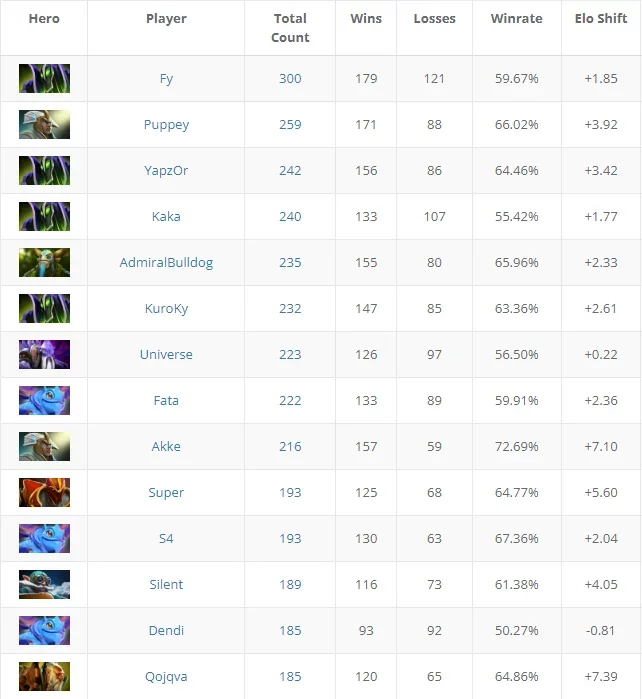 На втором месте расположился Клемент «Puppey» Иванов, который сыграл 259 матчей на Чене с винрейтом 66,02.