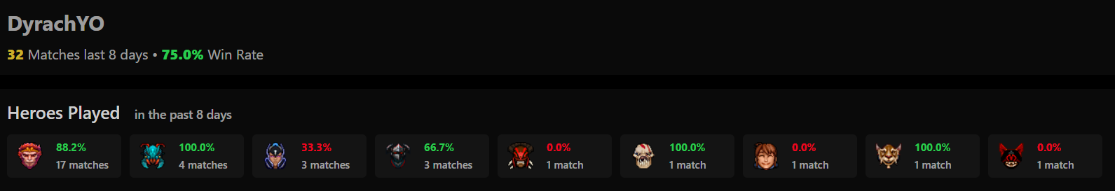 Антон «Dyrachyo» Шкредов выиграл 15 из 17 игр на МК в матчмейкинге за 8 дней. На про-сцене последний раз он использовал Манки Кинга в июле 2023-го на Riyadh Masters. Он проиграл 4 из 5 последних матчей на этом герое на профессиональном уровне.