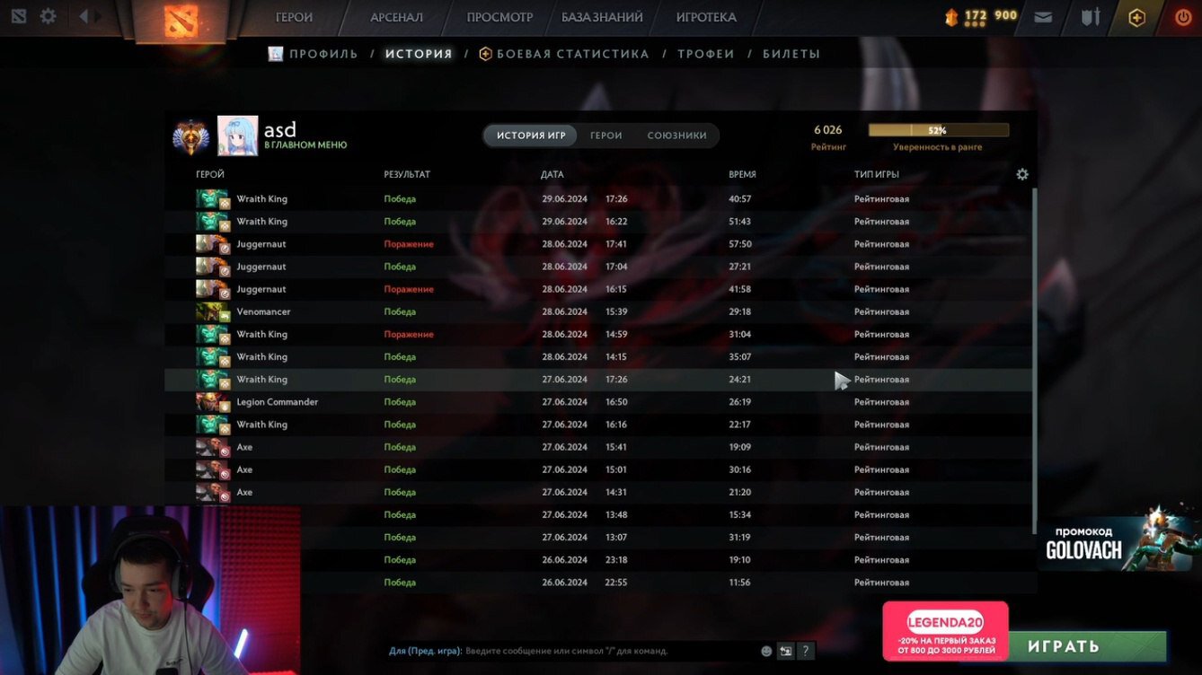 Головач апнул 6 тысяч MMR. Он сыграл 14 матчей на «Титанах» вне пати, из которых выиграл 8. Самым популярным героем стримера стал Wraith King (4-2).