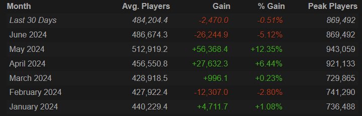 Средний онлайн упал приблизительно на 5% или на 27 тысяч человек – с 513 тысяч в мае до 486 тысяч в июне.