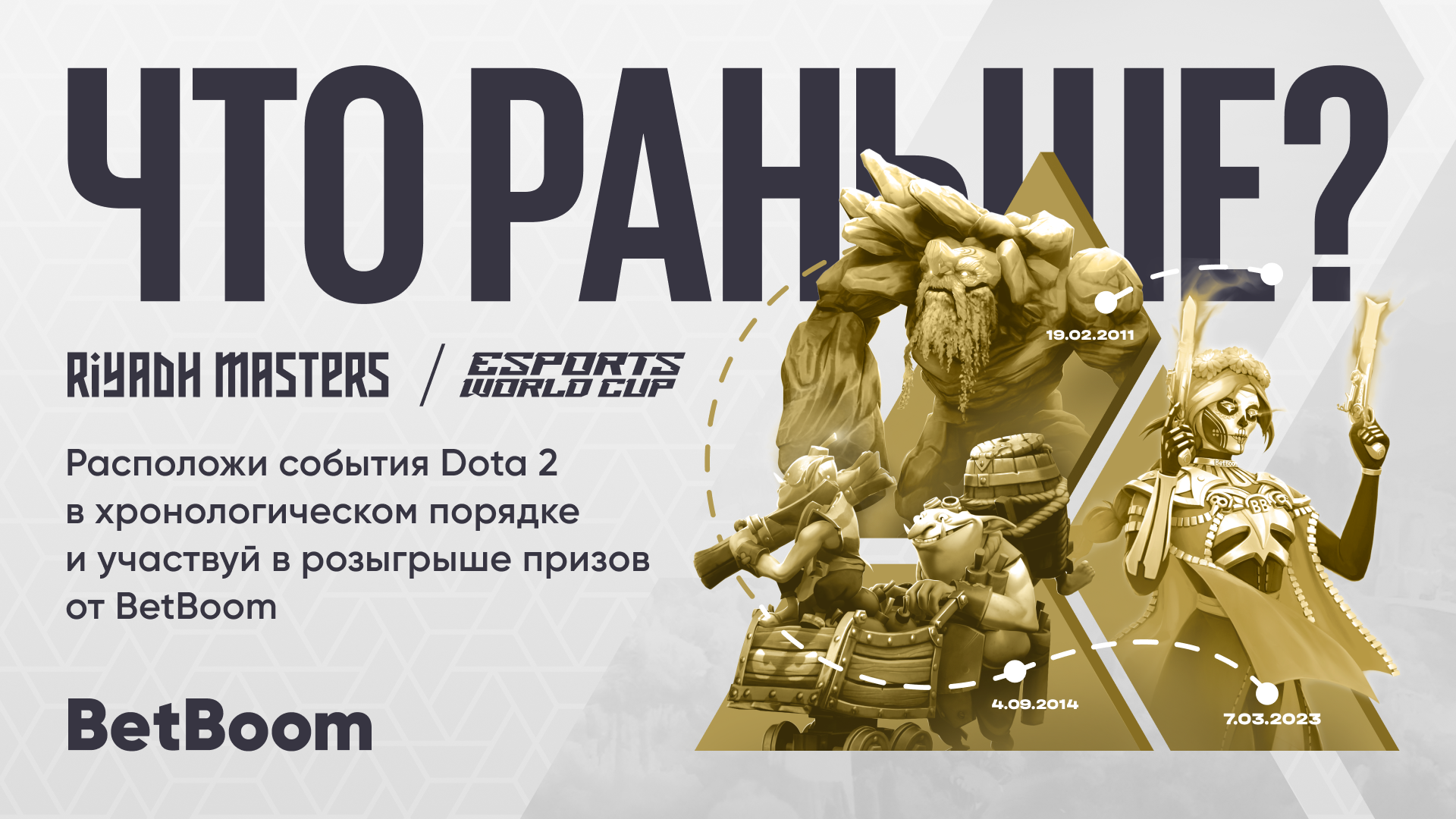 Букмекерская компания BetBoom запустила акцию «Что раньше?» к Riyadh Masters 2024 по Доте, которая пройдет с 4 по 21 июля. Это мини-игра на знание истории Доты и киберспортивной сцены, где участники должны расположить события в верном хронологическом порядке.