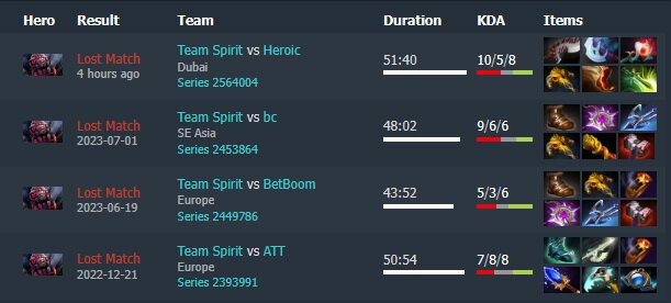 Оффлейнер Spirit сыграл ее со счетом 10-5-8, но проиграл. Статистика киберспортсмена на герое составила 4 поражения за 4 матча.