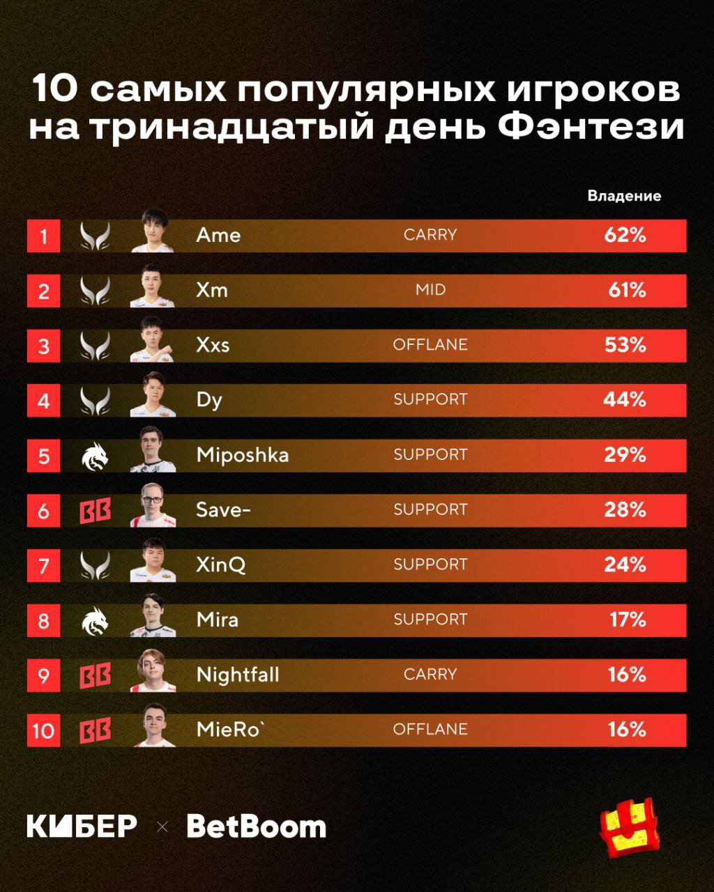Ван «Ame» Чуньюя пикали в 62% команд. Далее идут еще 3 игрока Xtreme и Ярослав «Miposhka» Найденов.