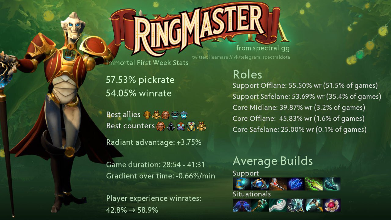Лучшими тиммейтами Рингмастера в матчмейкинге стали Sand King, Treant Protector, Omniknight, Visage и Storm Spirit.