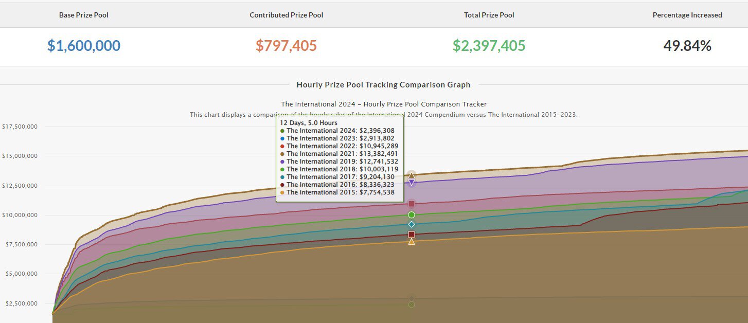Призовой фонд The International 2024 составляет 2,39 млн долларов. Компендиум, посвященный турниру, заработал 797 тысяч долларов за 12 дней и 5 часов.