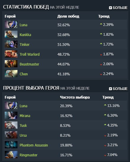 Луну пикнули на TI13 25 раз с винрейтом 68. Самым популярным героем турнира является Мирана – 36 пиков.