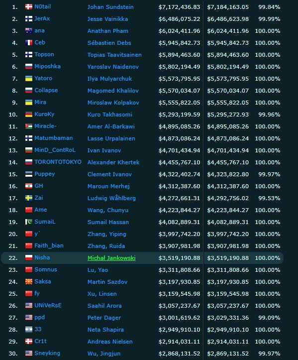33 займет 25-е место (3,18 млн долларов), а трио Boxi-Insania-Micke (2,09 млн долларов) поднимется на 42-44-е место, обогнав Романа «Resolut1ion» Фоминка (2,06 млн) и Алексея «Solo» Березина (2,02 млн). На 47-е место поднялся Маркус «Ace» Хелгард (2,05 млн долларов)