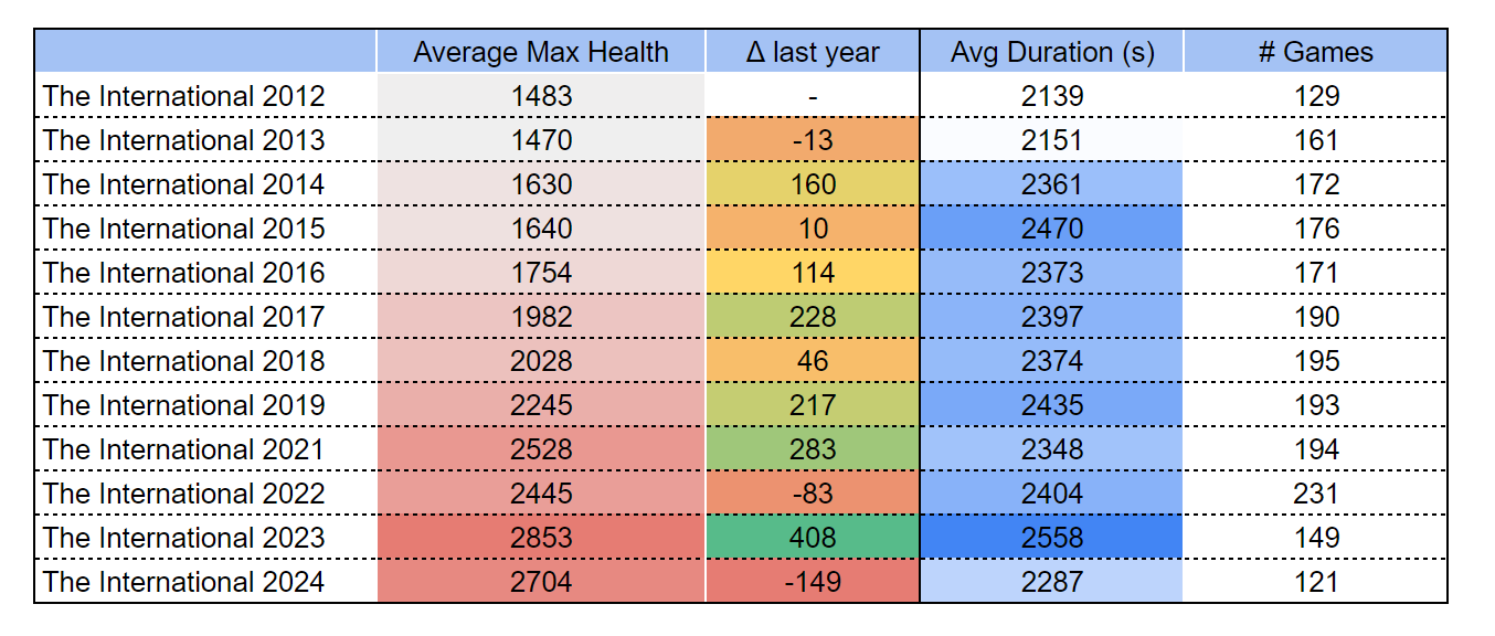 На TI12 среднее количество ХП составляло 2853. При этом матчи на том турнире в среднем длились дольше на 271 секунду.