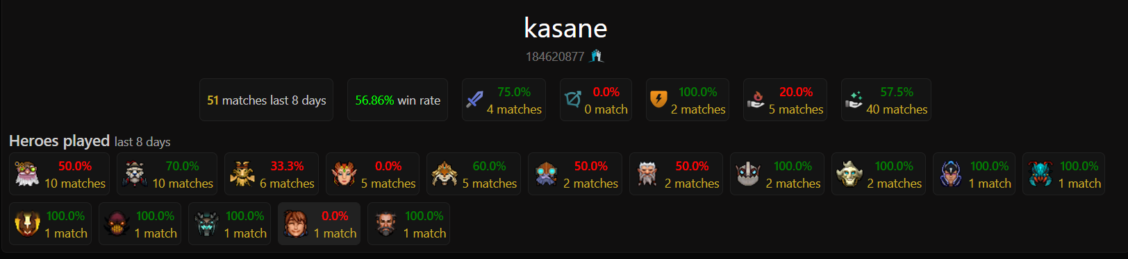 За последние 8 дней Kasane сыграл 51 игру в матчмейкинге, 40 из них – на «пятерке». Он активно играет на Снайпере, Таске, Тренте, Энче и Наге.