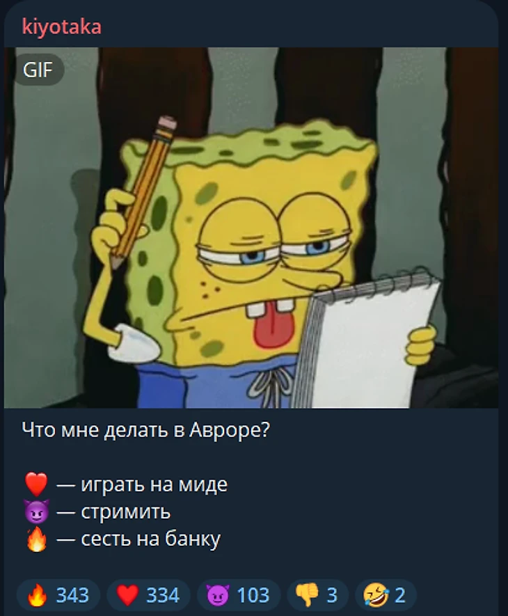 В телеграм-канале Kiyotaka провел опрос, что ему делать в Aurora. Из вариантов – «играть на миде», «стримить» и «сесть на банку».