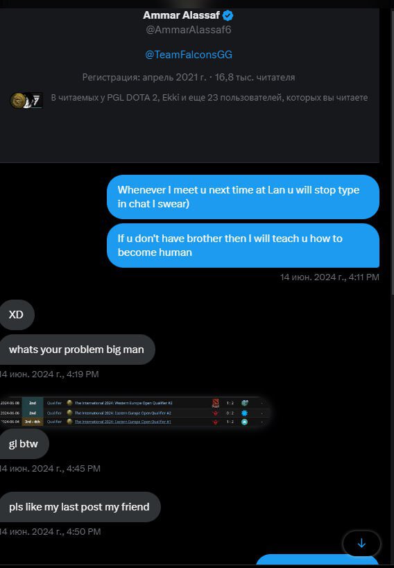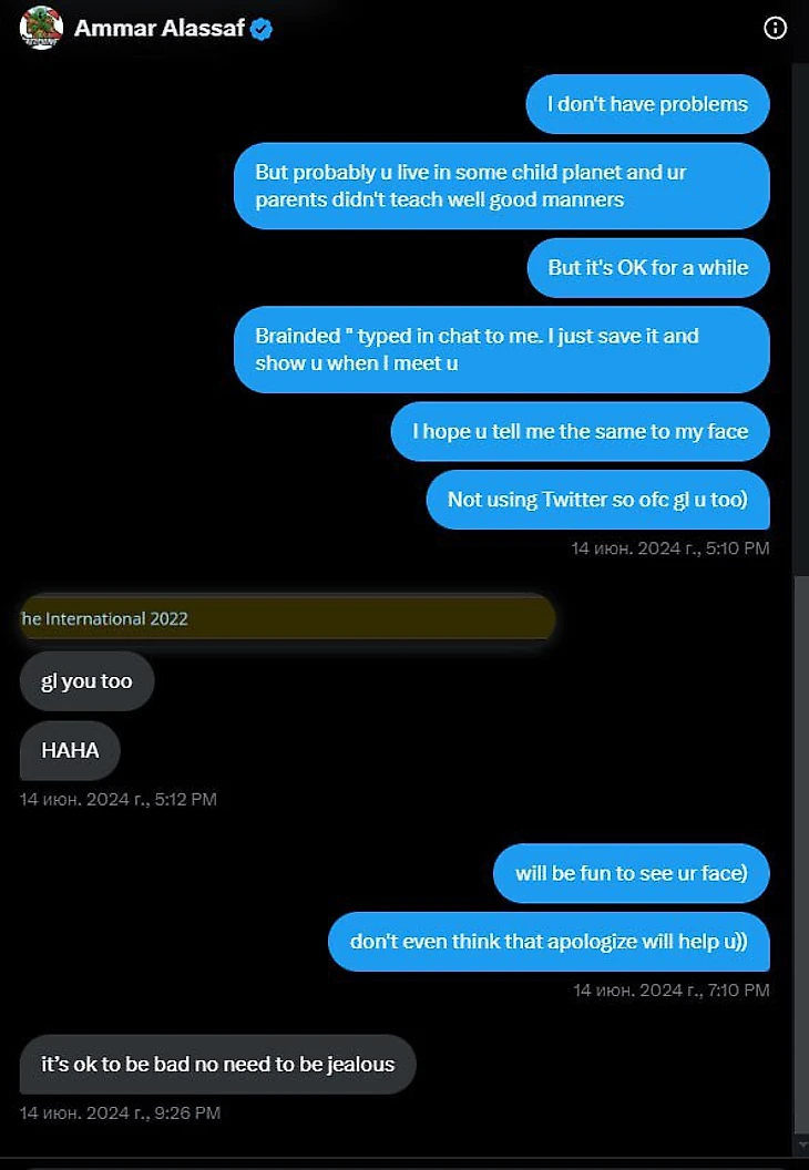 Я часто играю публичные матчи, и около 70% всех игроков у меня в муте – думаю, вы понимаете, почему. Аммар был у меня в друзьях, поэтому я видел его сообщения, и в одной из игр он назвал меня «braindead» (Кибер: тупоголовый). Меня это задело, и я написал ему в твиттере, сказав, что при встрече научу его манерам. Писал на эмоциях, признаю, что был резок, и приношу извинения за тон и формулировки. Я не угрожал ему физически и прикладываю скрины переписки, чтобы было понятно, что происходило.