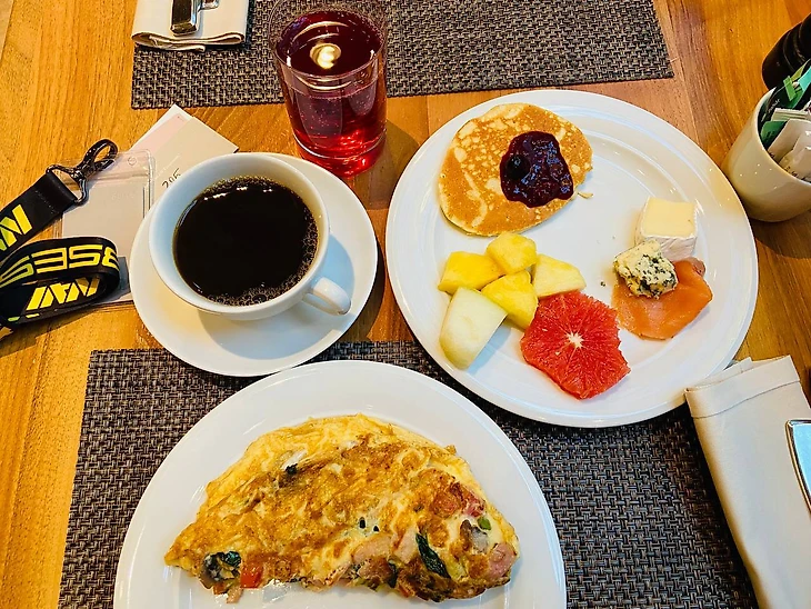 «На фото мой завтрак. Что касается питания на PGL – тут хорошие завтраки. Есть все, что пожелает человек с утра: фрукты, сыры, топинги, выпечка свежая и при тебе приготовленная, орешки, йогурты, яйца всех видов и приготовленная поваром для тебя, соки, официанты бегут и делают сразу свежесваренный кофе, даже есть новинки из микромолекулярной кухни.