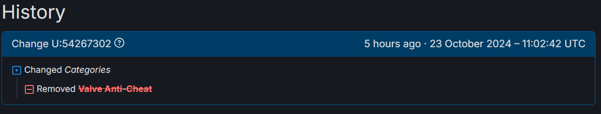 23 октября категория Valve Anti-Cheat была удалена из Dota 2 и Counter-Strike 2.