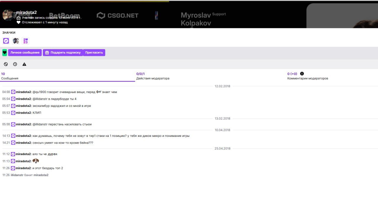Илья «Illidan» Пивцаев показал историю сообщений Мирослава «Mira» Колпакова на своем Twitch-канале.