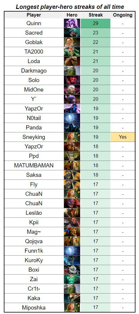 Бен «Noxville» Стинуизен также поделился статистикой лузстриков на одном персонаже на про-сцене. Первое место делят Андрей «ALWAYSWANNAFLY» Бондаренко (Bane), Акбар «SoNNeikO» Бутаев (Grimstroke) и Го «Shiro» Сюаньан (Spectre). У них по 14 поражений подряд.