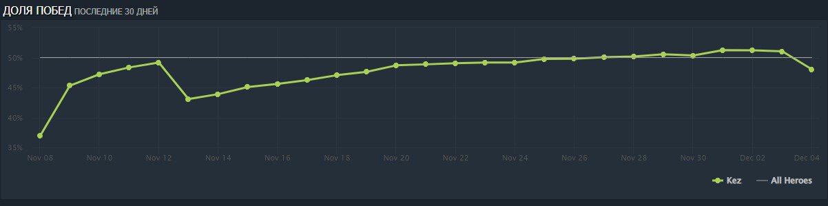 Перед выходом обновления винрейт героя составлял 51,03. На данный момент доля побед Кеза находится на отметке 47,86%.