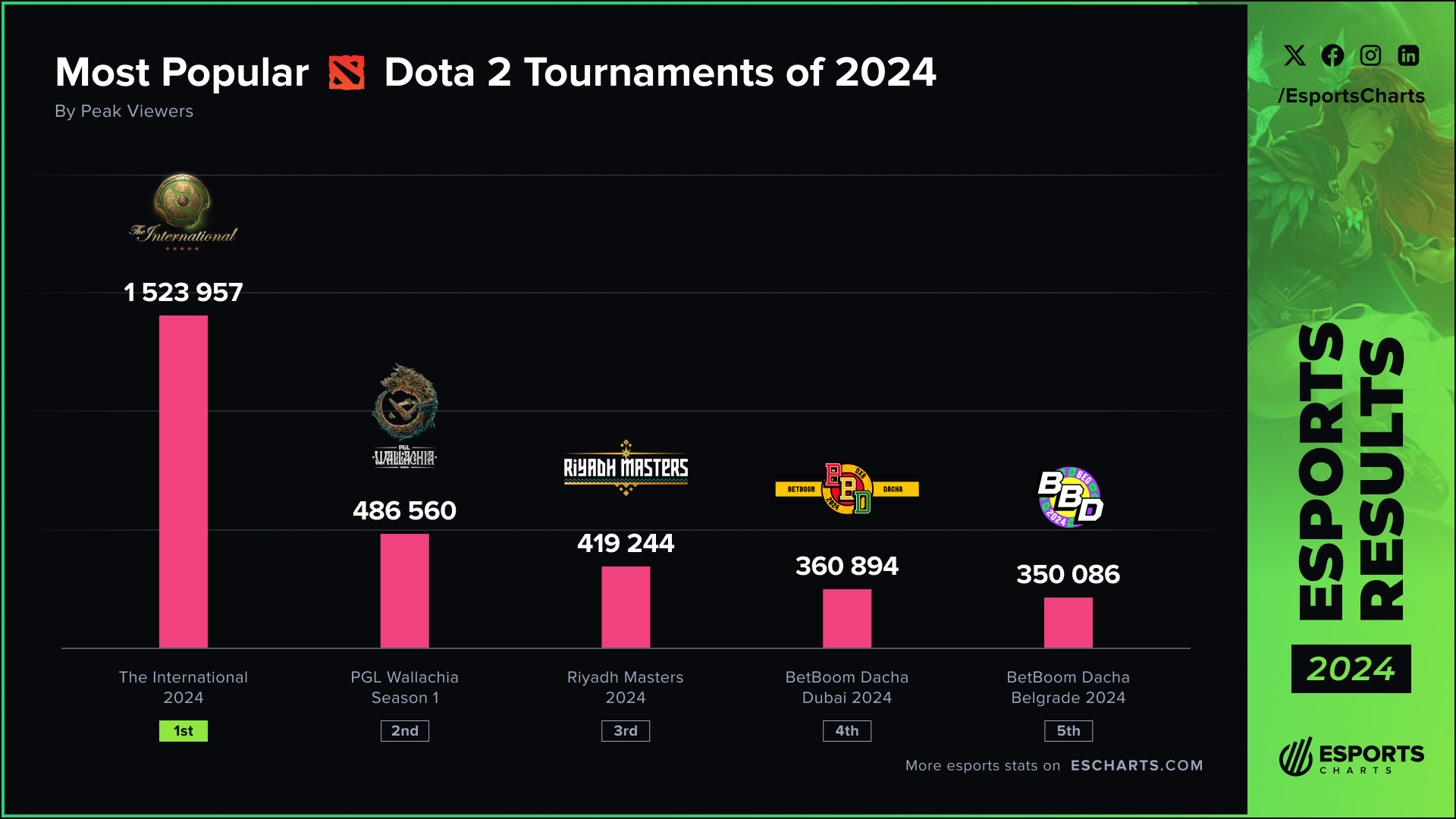 The International 2024 стал самым просматриваемым турниром по Доте в 2024 году. В пике за чемпионатом следили 1,5 млн зрителей.