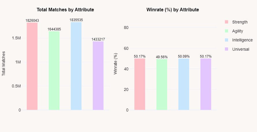 Наибольшее число матчей принадлежат героям с атрибутом интеллекта – более 1,835 млн. Реже остальных пикают универсалов – 1,433 млн.