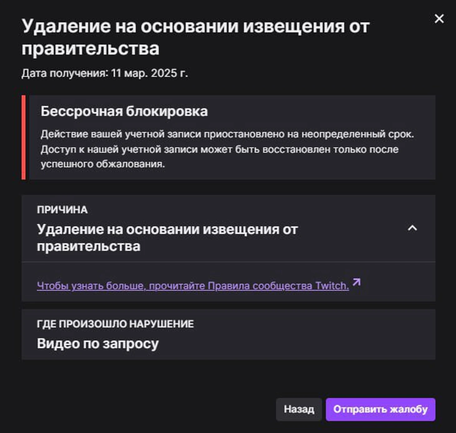 «Апелляцию подали, за что именно [забанили] – нет информации. Большая надежда, что сошел с ума бот на Твиче или просто ошибка», – прокомментировал блокировку стример.