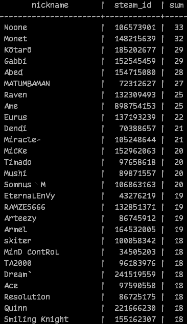 В топ-27 также попали Данил «Dendi» Ишутин (21), Роман «Ramzes666» Кушнарев (19), Айбек «TA2000» Токаев (18), Роман «Resolut1on» Фоминок (18) и Алексей «Smiling Knight» Свиридов (18).