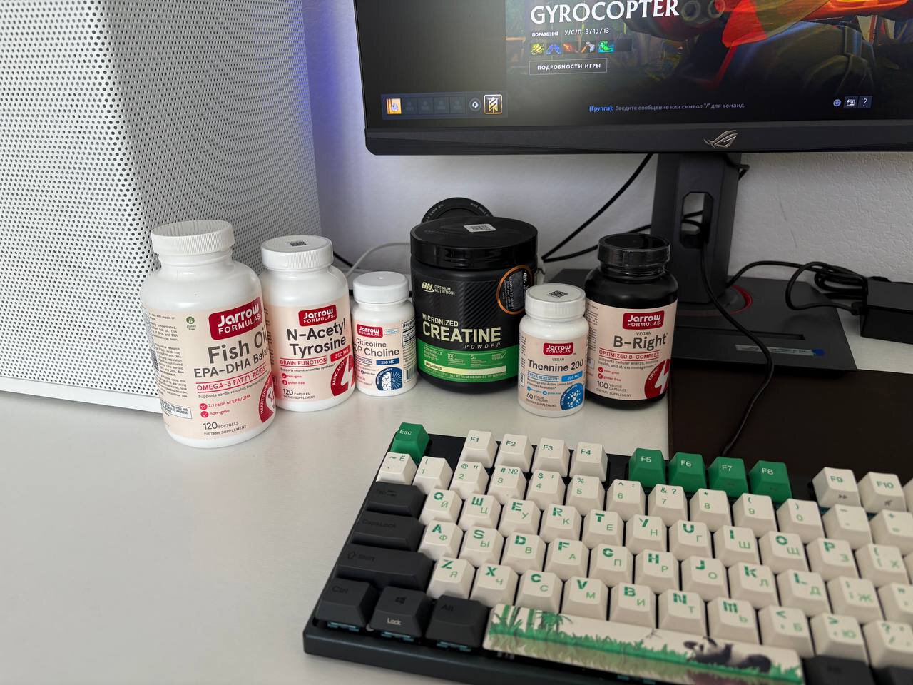 Эдгар «9Class» Налтакян опубликовал фотографию с набором витаминов на его рабочем столе: рыбий жир, тирозин, креатин, цитиколин, теанин и комплекс витаминов группы B.