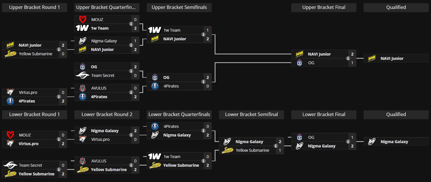 NAVI Junior, Yellow Submarine, Virtus.pro и 4Pirates начнут выступление с первого раунда верхней сетки, остальные команды – со второго.