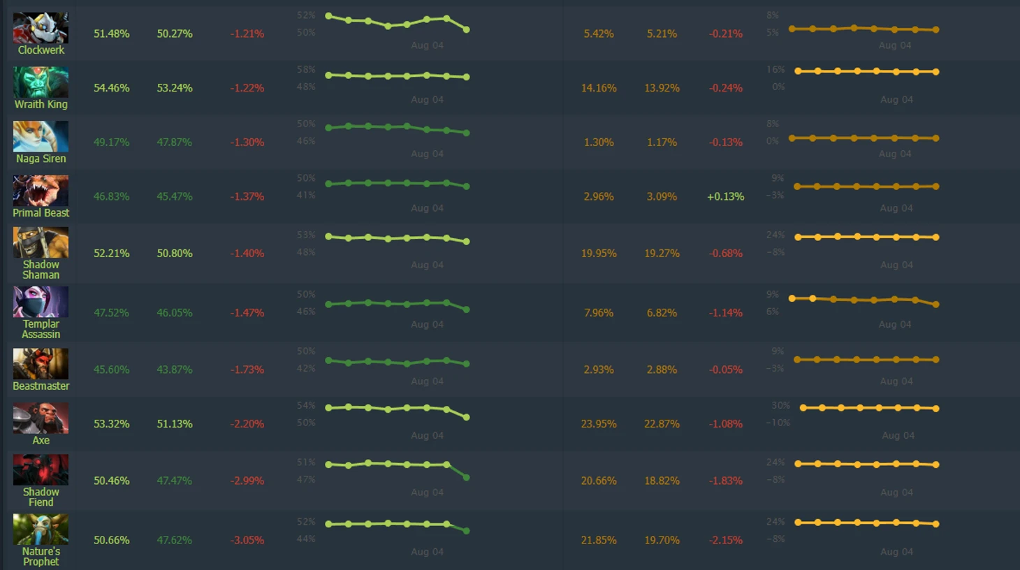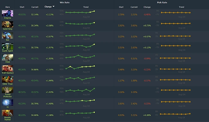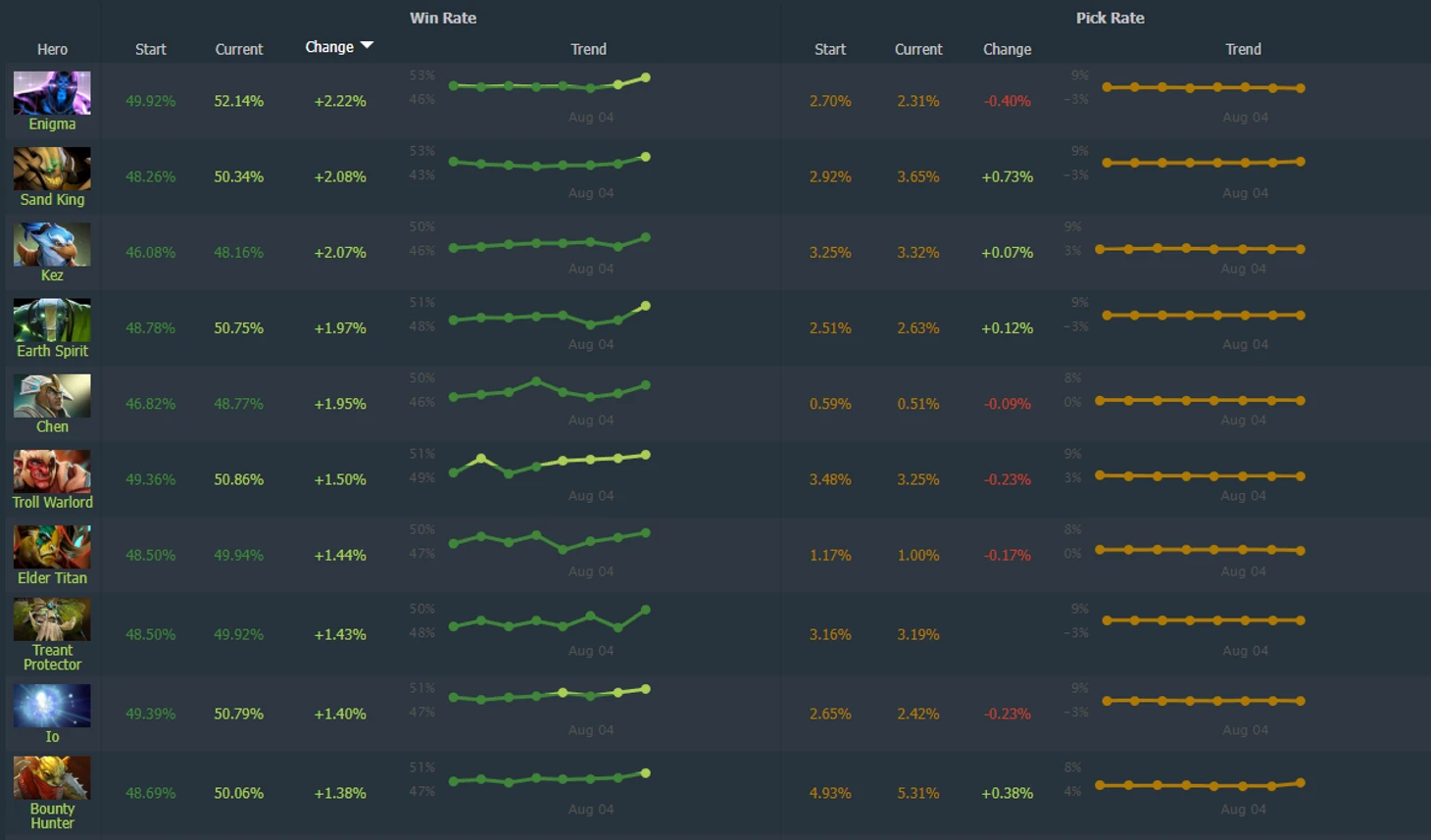 Винрейт Сэнд Кинга вырос на 2,08%, Earth Spirit – на 1,97%, а Энигмы –2,22% . Кроме того, значительно вырос винрейт Кеза (2,07%), Виспа (1,40%) и Трента (1,43%).