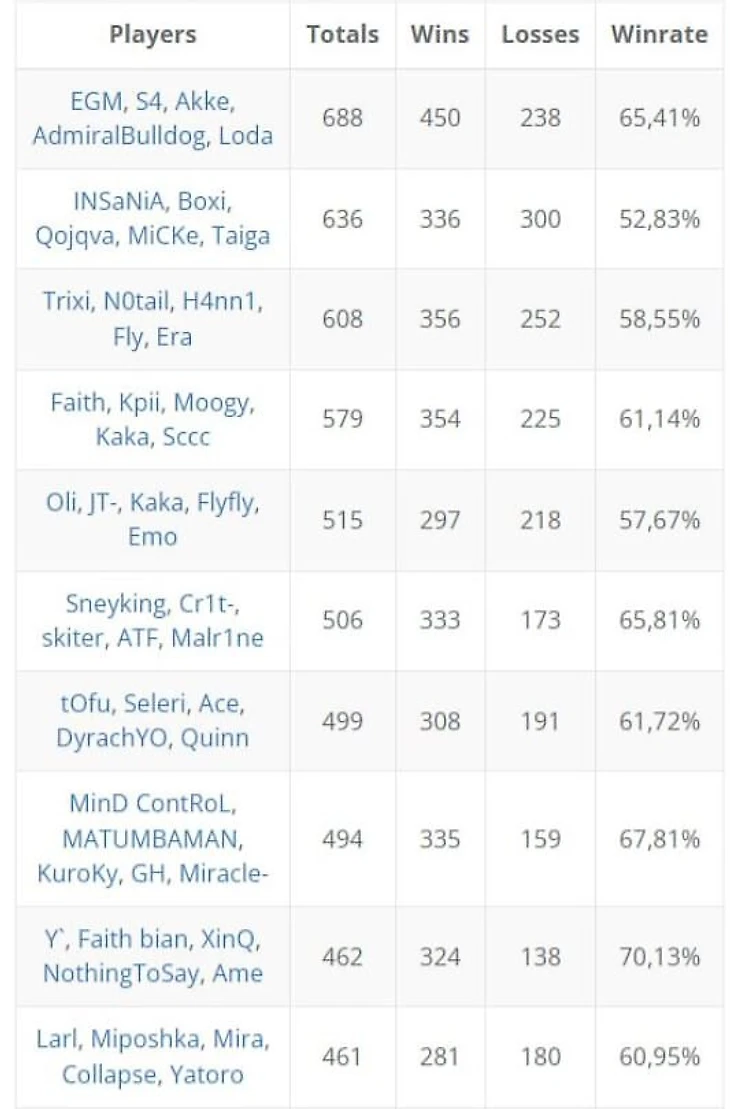Лидирует по этому показателю состав Alliance (Loda, AdmiralBulldog, S4, EGM, Akke). Вместе ростер сыграл 688 карт. Liquid (Micke, Qojqva, Boxi, Taiga, Insania) – топ-2 с 636-ю картами.