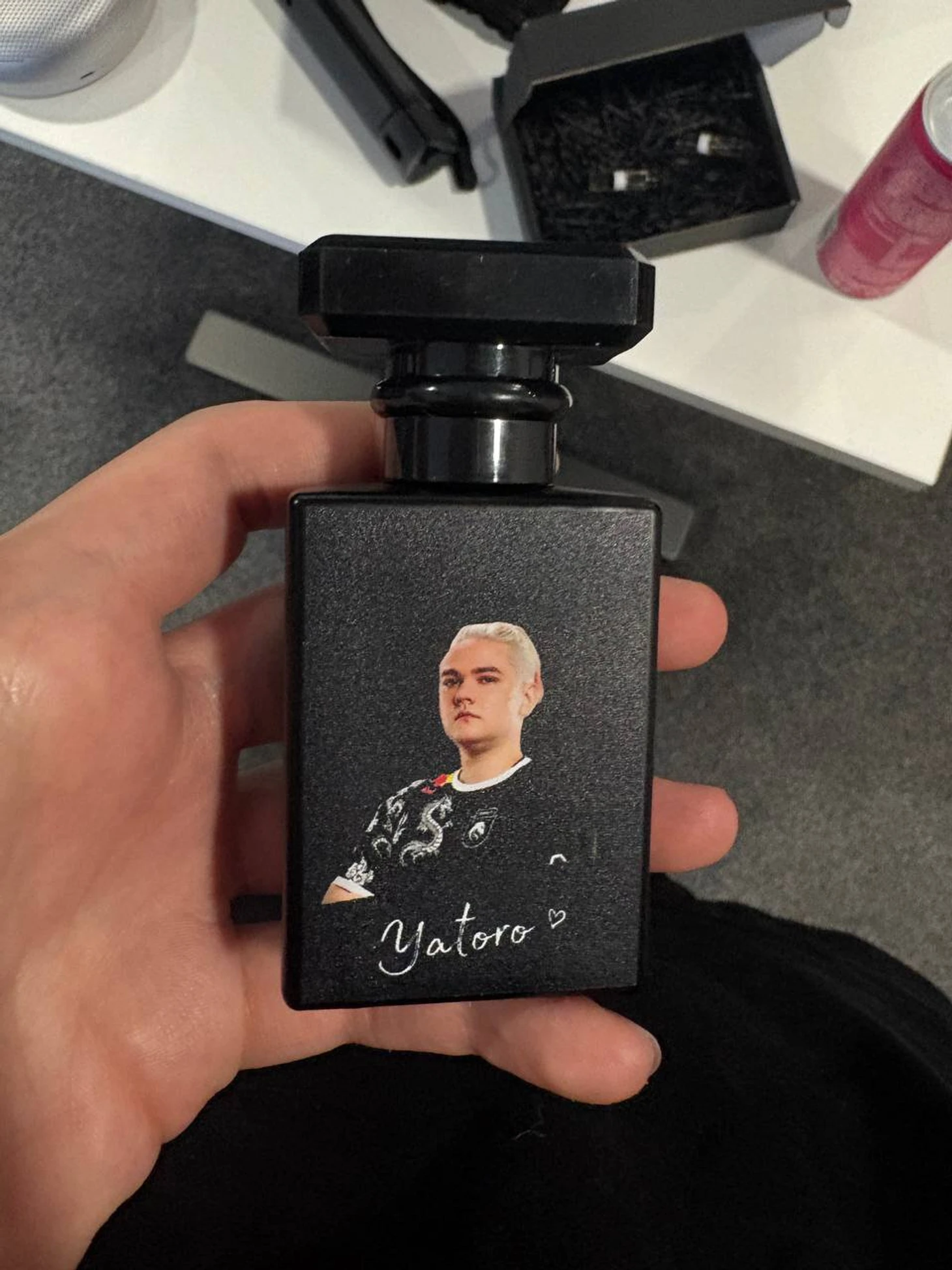 Александр «Rue» Филин также выложил фотографию с духами, на которых изображен Илья «Yatoro» Мулярчук и нанесен его автограф.