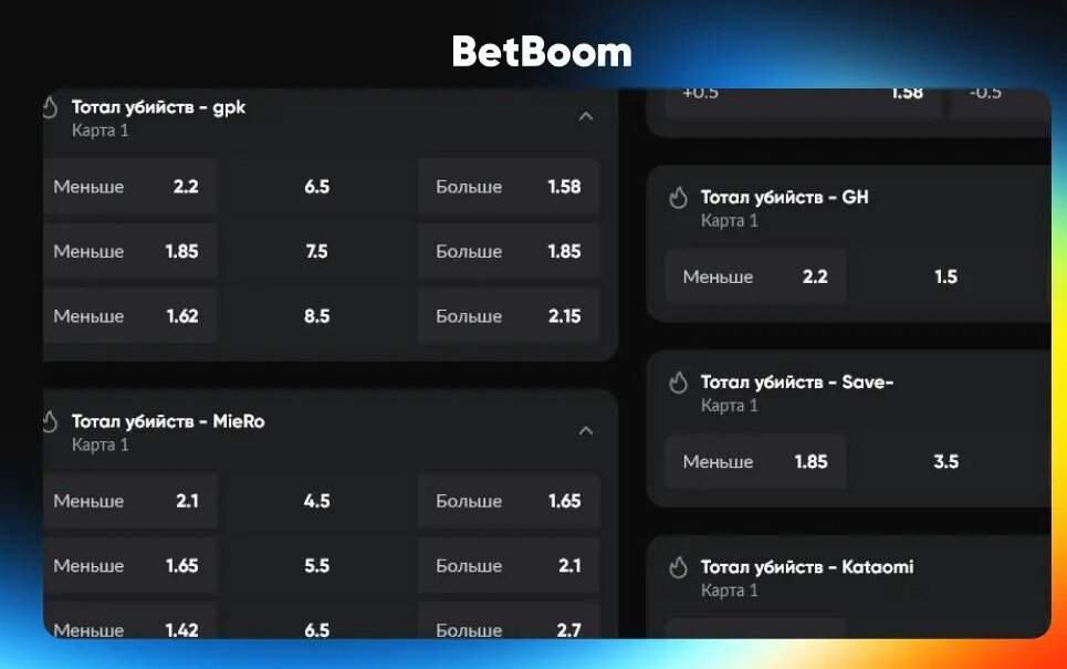 Для пользователей букмекерской компании открылась возможность делать ставки на индивидуальные тоталы убийств игроков на картах. Например, можно поставить на ТБ 7,5 киллов у Данила «Gpk» Скутина из BetBoom Team на первой карте против Nigma с коэффициентом 1.85.