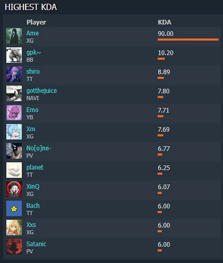 Ван «Ame» Чуньюй занимает первую строчку с наилучшим показателем KDA – 90. Данил «Gpk» Скутин расположился на втором месте с отставанием в 9 раз, а замыкает тройку Го «Shiro» Сюаньан с показателем 8,89.