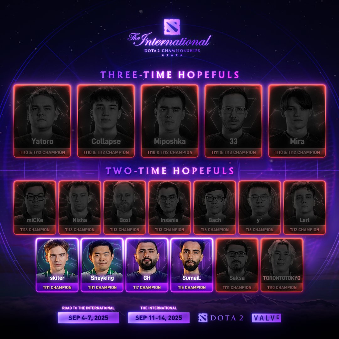 Среди 19 таких игроков на The International 2025 осталось 4 киберспортсмена: Саид Сумаил «SumaiL» Хассан, Марун «GH» Мерхей, Цзинцзюнь «Sneyking» Ву и Оливер «Skiter» Лепко. Все они могут взять TI во второй раз в карьере.