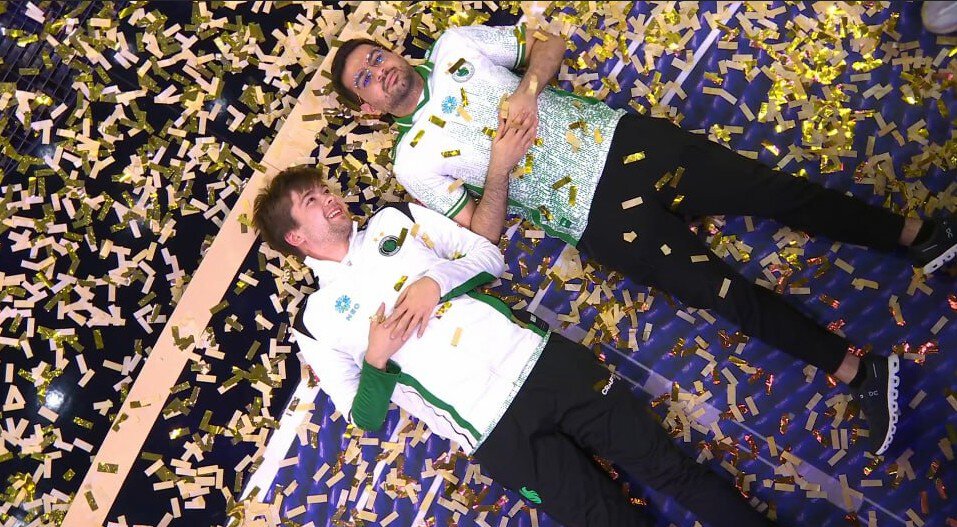 Станислав «Malr1ne» Поторак и Аммар «ATF» аль-Ассаф после победы в гранд-финале The International 2025 улеглись на сцене, повторив мем из сериала «Во все тяжкие» с Патриком Куби и Хьюэллом Бабино, которые лежали на стопках купюр.