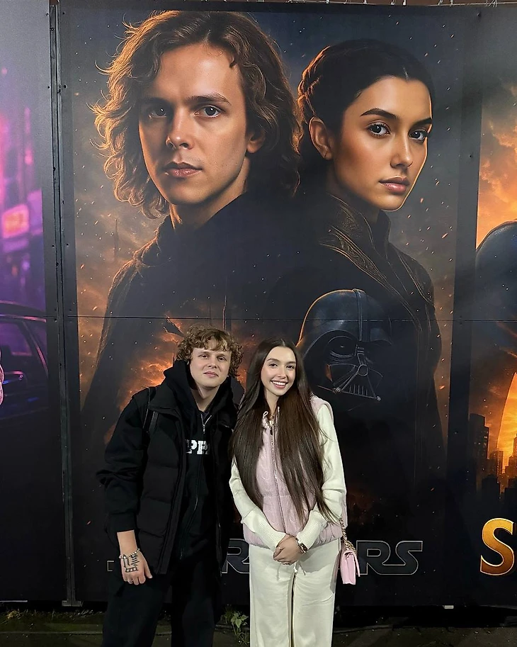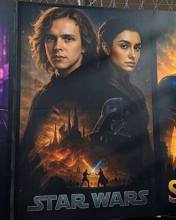 Постер со «Звездными войнами», на котором изображены Дурачье и Соняша в роли Энакина и Падме – ИИ-плакат из компьютерного клуба Invasion. Кроме них, в клубе есть постеры с комиком Ильей «Satyr» Шабельниковым, стримером Вячеславом «Buster» Леонтьевым и другими известными персонами.