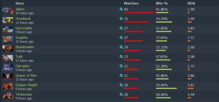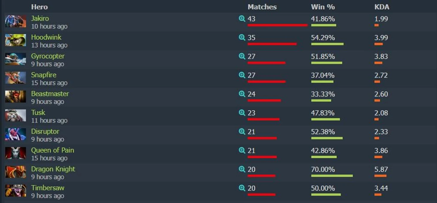 Следом по количеству пиков расположились Hoodwink (35 пиков, 54,29% винрейт), Gyrocopter (27, 51,85%) и Snapfire (27, 37,04%).
