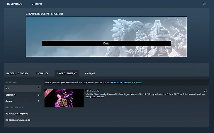 В разделе Steam «Дополнительный контент» для Доты, под плашкой «Скоро выйдут», находится трек Cadillac от Элджея и Моргенштерна (признан Минюстом РФ иноагентом). Дата выхода и стоимость саундтрека неизвестны.