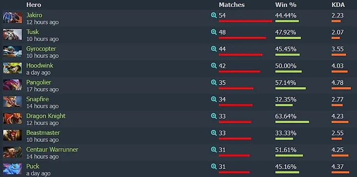 Чаще всего в пиках команд появлялся Jakiro – 54 раза (винрейт – 44,44%). Следом расположились Tusk (48 пиков – 47,92% винрейт) и Gyrocopter (44 – 45,45%).