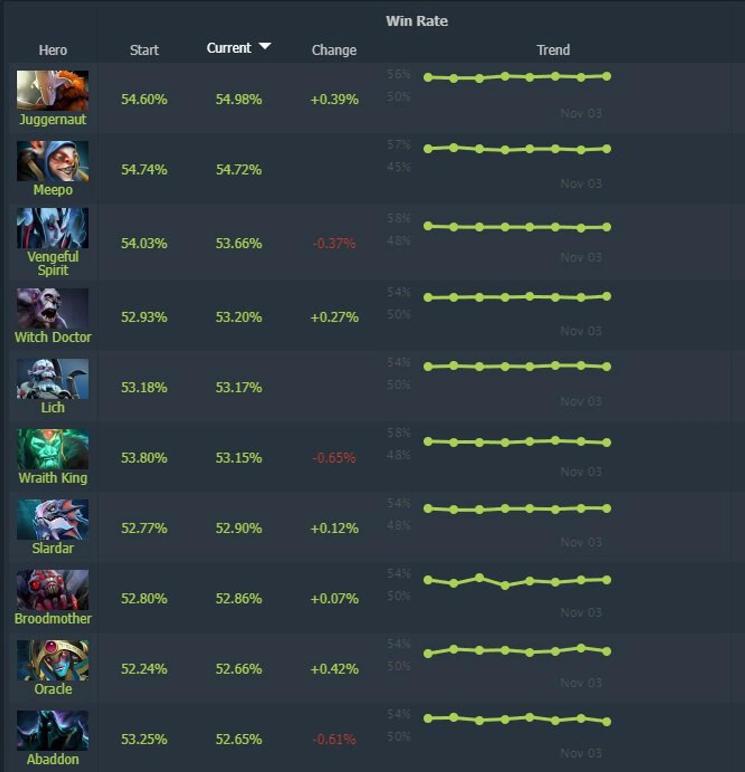 Худший винрейт при этом показывают Beastmaster, Monkey King и Tiny – от 44 до 44,3.
