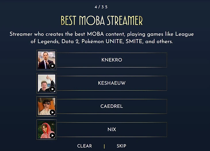Помимо Александра «Nix» Левина, за награду «MOBA-стример года» также поборются Knekro, Keshaeuw и Caedrel.