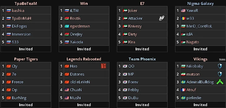 Участники: Nigma, Vikings, Phoenix, Legends Rebooted, Paper Tigers, E7, Win, TpaBoTeaM.