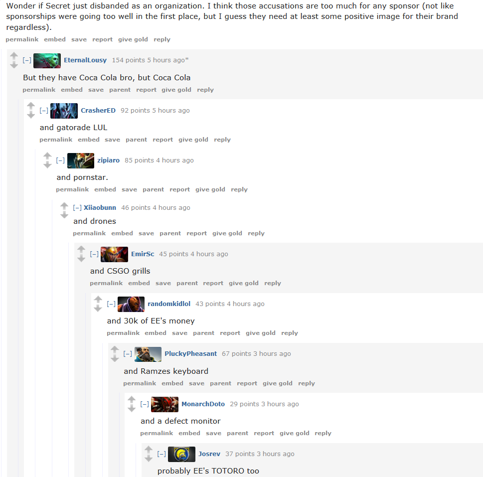 Ну и сразу после этого блога организаторы The Summit сообщают, что Secret снимаются с турнира. Причин никто не рассказал, так что Reddit приходится их додумывать.