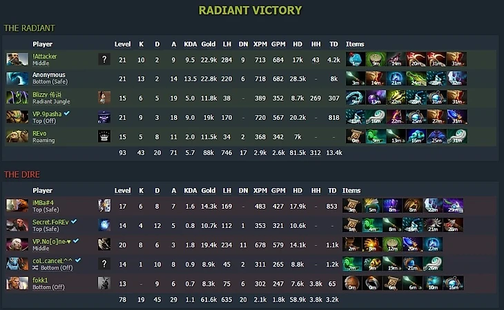 Итоговый скриншот матча, который принес Лассе заветное достижение. В этой игре он играл на Morphling, просто его дотабафф скрыт.