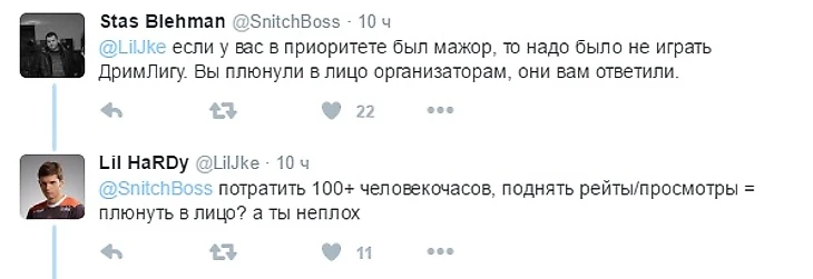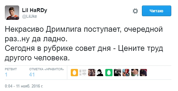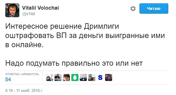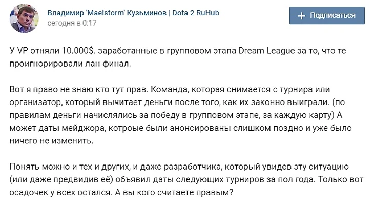 С одной стороны, все понятно – Virtus.Pro потратила время на турнир, но не получила денег. С другой – команда нанесла серьёзный удар по репутации Dream League, и организация должна принять меры. Но почему Dream League выбрала такое неудачное время для турнира? И зачем участвовать в турнире, который не вписывается в график? Обе стороны действовали на авось и обе пострадали.Что думает общественность?Виталий «v1lat» Волочай не сомневается в том, что команду нужно наказать, но не уверен на счет метода.Игрок Илья «Lil» Ильюк высказался более категорично и даже объяснил свою позицию в комментариях.Комментатор Владимир «Maelstorm» Кузнецов считает, что понять можно обе стороны.А вы как считаете?