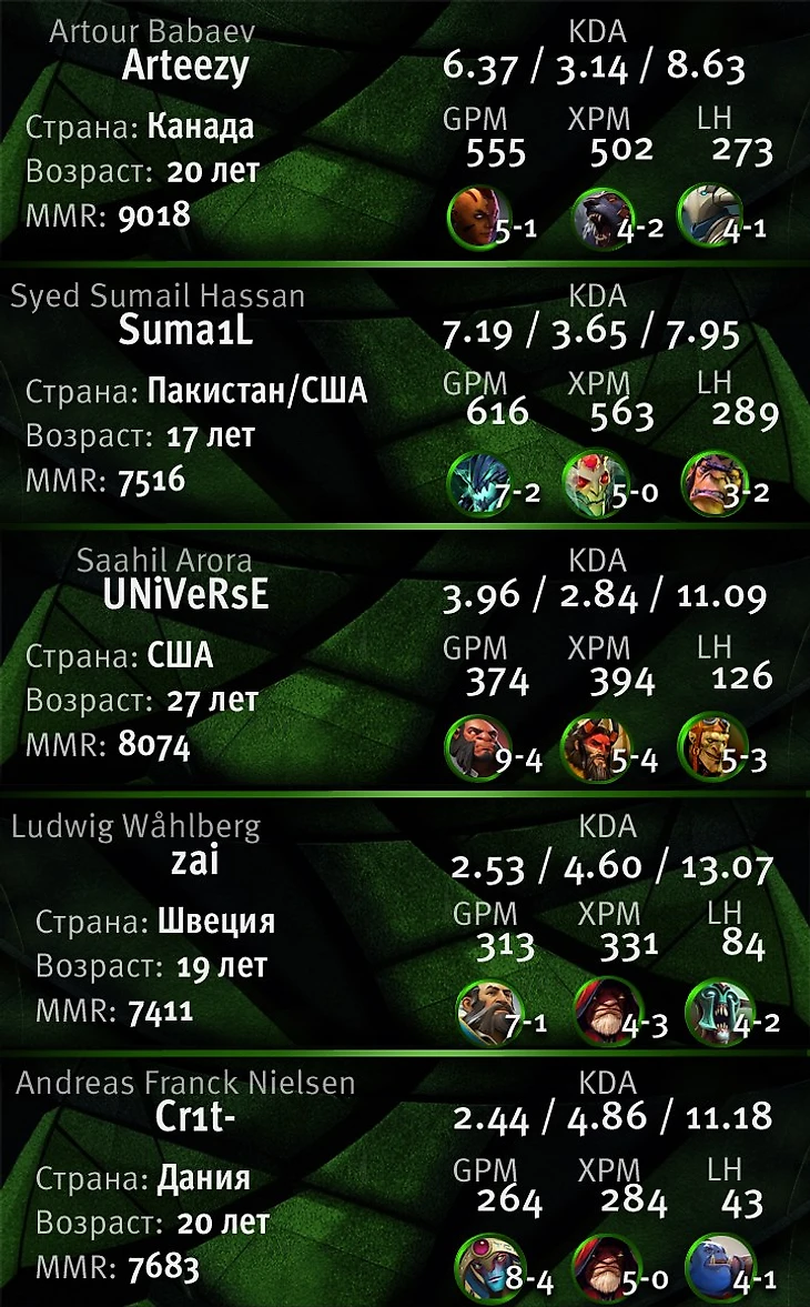 А вместе с ними играют Universe, Crit и Zai – киберспортсмены, которых называли лучшими на своей позиции если не в мире, но на западной сцене точно. Каждый из них – герой хайлайтов, затащивший для своих команд не одну игру.