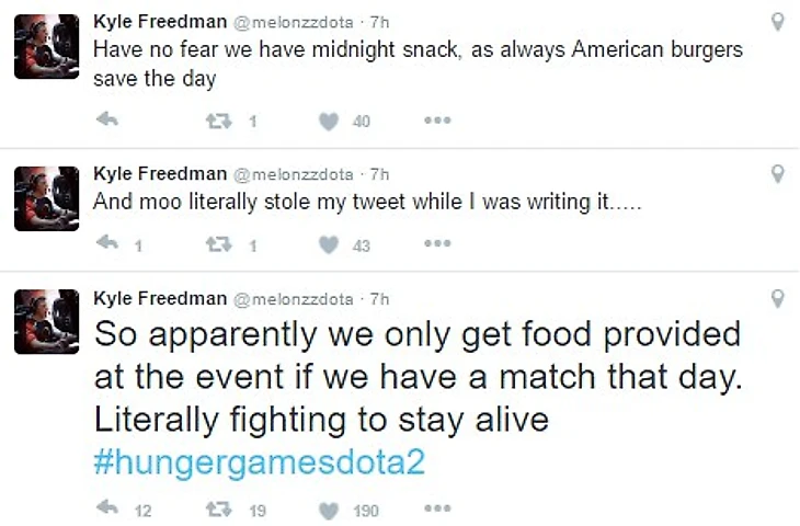 «Кажется, нас будут кормить, только если у нас есть матчи в этот день. Буквально борьба за выживание. Не бойтесь, у нас есть, чем перекусить на ночь. Американские бургеры снова спасли этот день. Пока я писал, Moo уже успел украсть мой твит...»