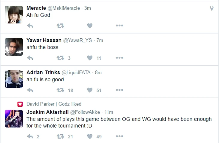 Сначала они обыграли Wings в первом матче группового этапа, потом навязали им серьезную борьбу OG в матче за первое место. Ну а compLexity рядом с малайцами просто выглядели стаком паберов, непонятно как попавшим на турнир. И все это – благодаря выверенным драфтам Af Hu, которые оценили и другие капитаны, и аналитики турнира.