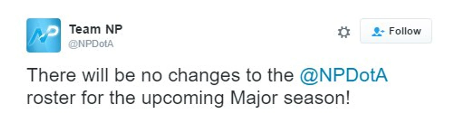 Team NP не будет менять состав. В него входят Джеки «Eternal Envy» Мао, Кертис «Aui_2000» Лин, Ариф «MSS» Анвар, Авери «SVG» Силверман и Тибан «1437» Сива.