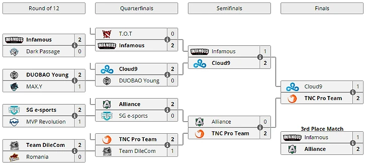 Группа A 1. To.be.or.not.to.be 3-2-02. Team DileCom 2-3-03. MVP Revolution 2-2-1 4. Horde 1-4-05. Bravado Gaming 1-0-46. T Show 0-1-4 Группа B1. Cloud9 4-1-02. SG e-sports 3-2-03. Romania 1-3-1 4. Fantastic Five 1-2-25. Team X-Bet 1-1-3 6. Vultur 0-1-4Группа С1. Alliance 4-1-02. DUOBAO Young 4-1-03. S1 Lykos 2-0-34. Aboshamalah 2-0-3 5. Dark Passage 2-0-3 6. Team One Ecuador 0-0-5Группа D1. TNC Pro Team 3-1-12. Infamous 3-1-1 3. MAX.Y 2-2-1 4. Team Ukraine 1-3-15. Comanche 0-3-1 6. Signature.Trust 0-2-3Сетка и расписание плей-офф