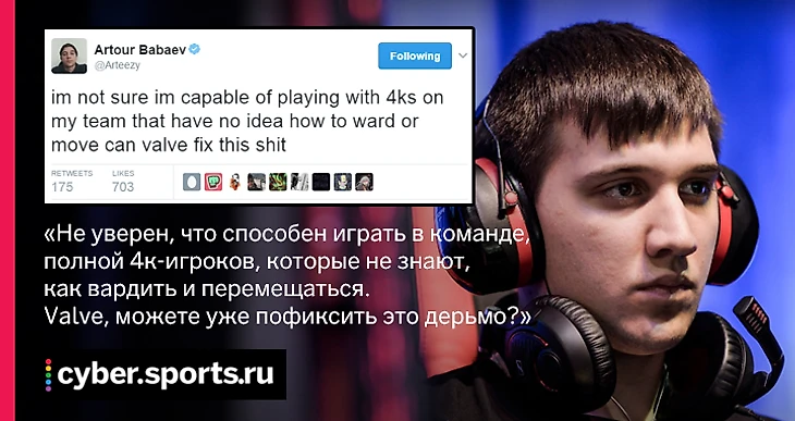 Артур «Arteezy» Бабаев – очень требовательный игрок. Нет сомнений, что в Valve есть отдельный наблюдатель за твиттером Артизи, который сообщает, что надо поправить в доте. Но это не спасает компанию от праведного гнева Артура.